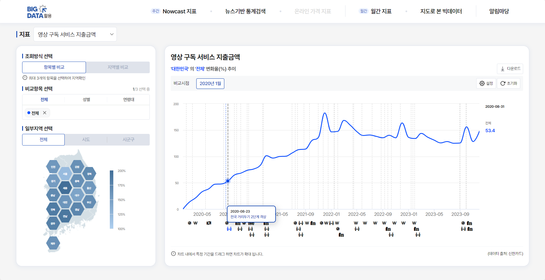 | 영상구독 지출금액 | 전국, 시도, 시군구 | 성별 | 연령대 | ||||