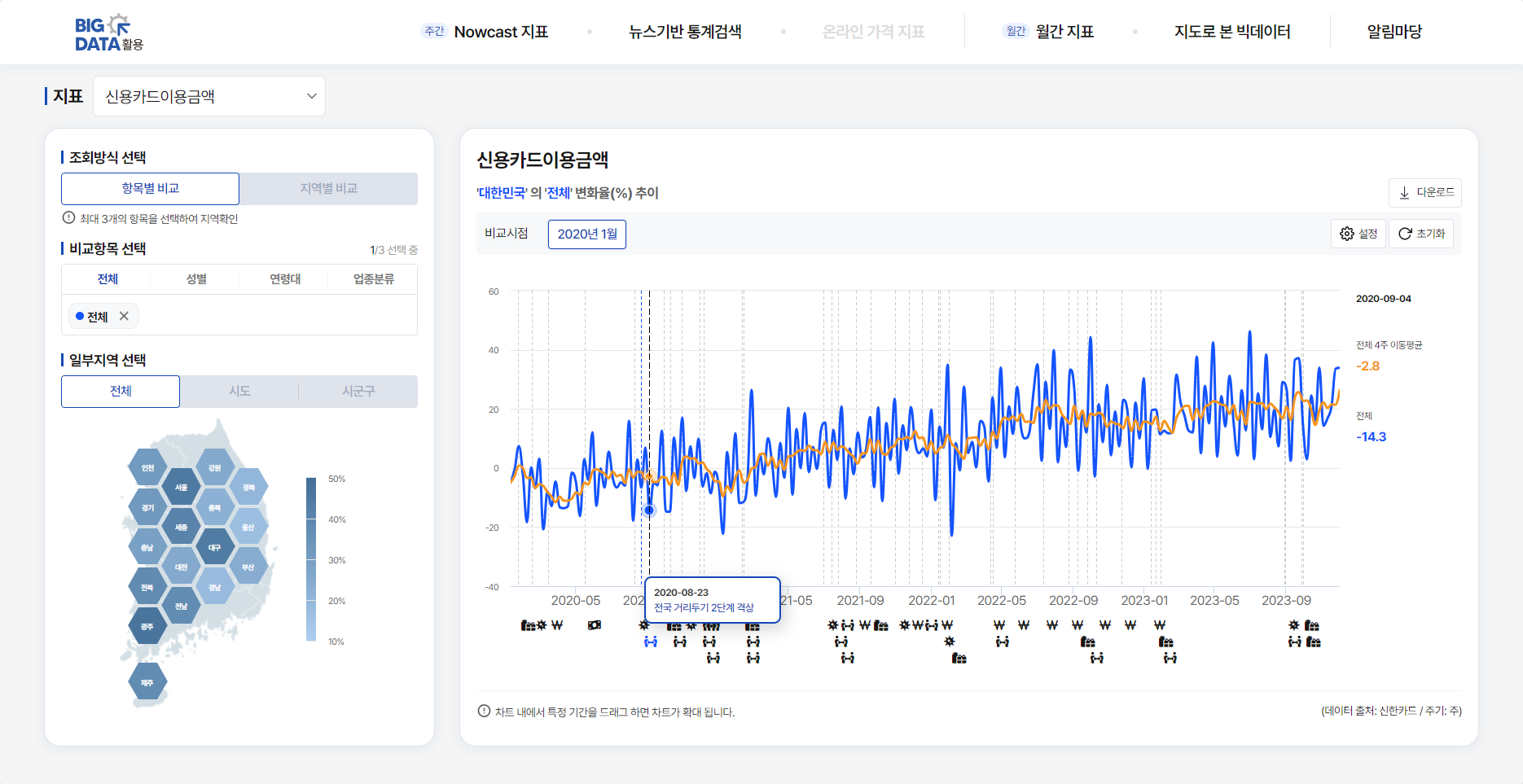 통계청은 공식 통계와 최대한 상관성을 가지는 민간 또는 공공 데이터를 이용하여 속보성 지표를 개발하고 나우캐스트(Nowcast) 포털에서 주간 단위로 시의성 있고 상세하게 전달하고자 합니다.