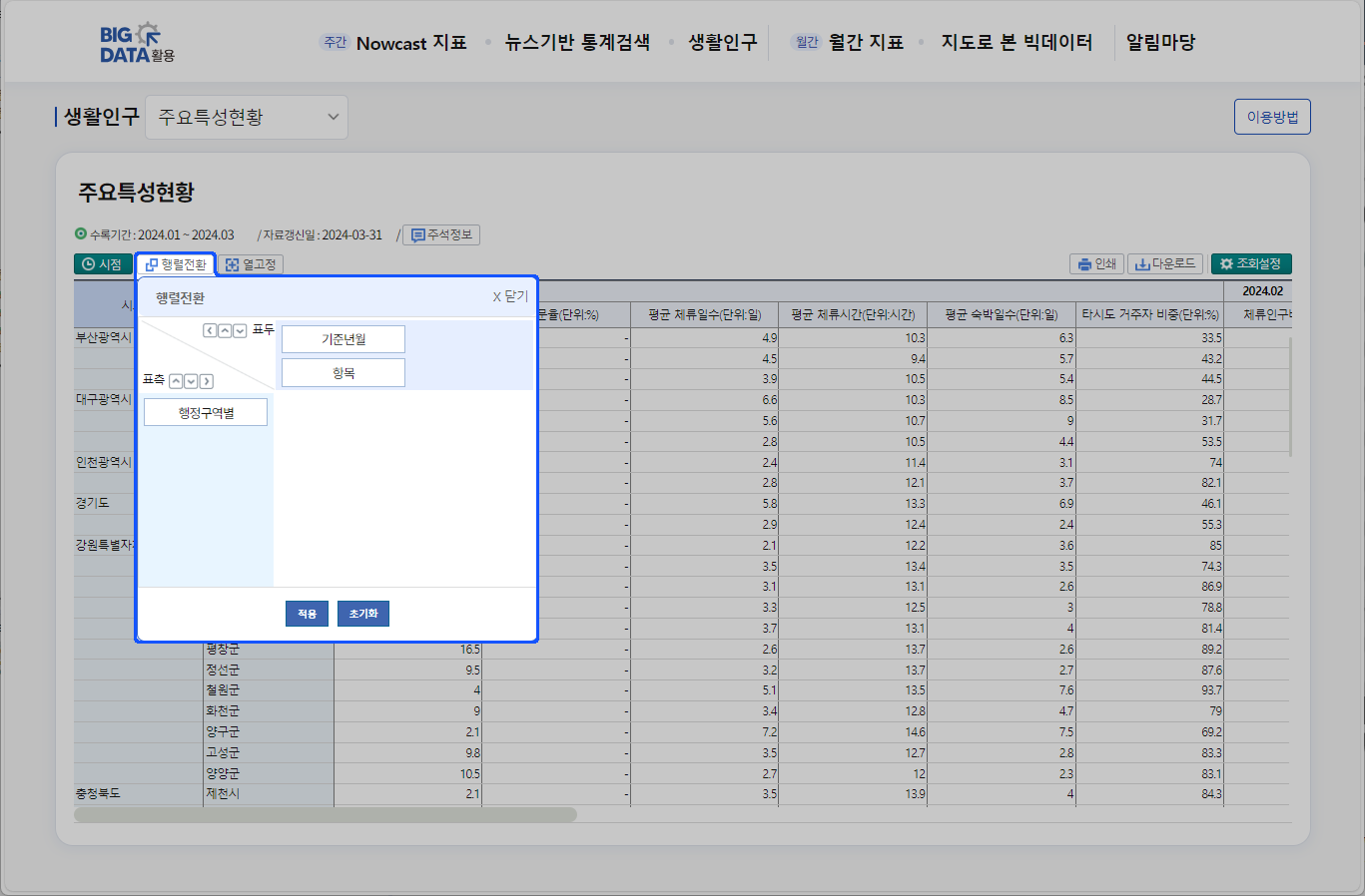 STEP3 행렬전환 선택· 표두와 표측을 원하는 항목을 이동하여 자료를 제공됩니다.· 항목을 클릭후 드레그하여 표두 또는 표측으로 이동시킨 후 '적용'을 클릭하면 변경된 테이블로 출력합니다. · '초기화'를 클릭하면 최초 조회 화면 상태로 표두와 표측 항목을 초기화 합니다.