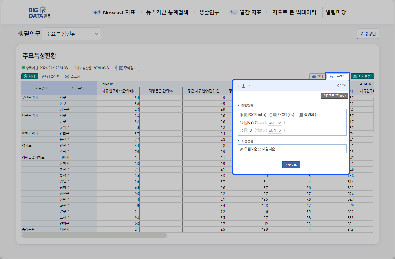 STEP4 다운로드· 엑셀, CSV, TXT 파일을 내려받을 수 있습니다.· 엑셀의 경우 '셀 병합' 체크하면 표측에 해당하는 내용에 대해 병합처리된 상태로 다운로드 합니다.· CSV,TXT 파일은 ANSI, UTF-8 파일 포멧을 선택하여 다운로드 할 수 있습니다.· 오름차순, 내림차순 선택에 따라 시점정렬된 상태로 자료를 다운로드 할 수 있습니다.