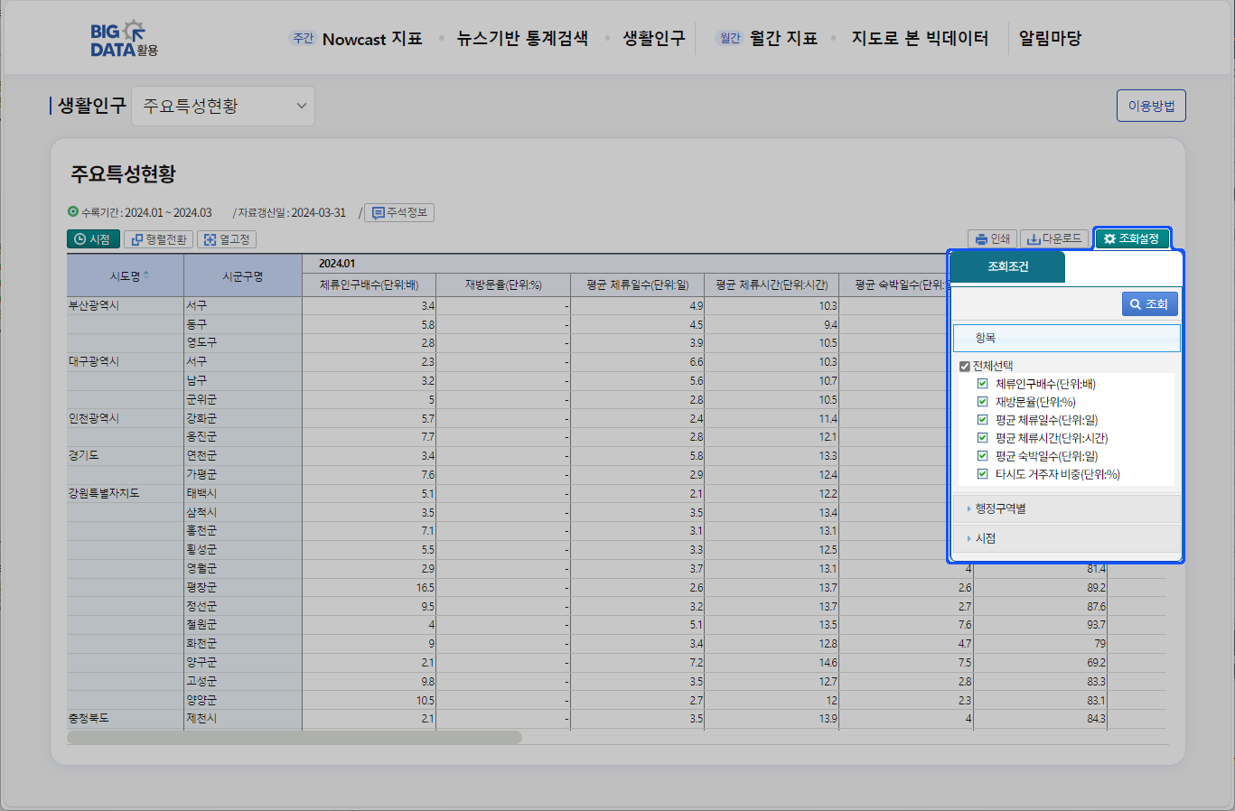 ① 시도별, 시군구별 세부적으로 선택하여 조회 할 수 있습니다.