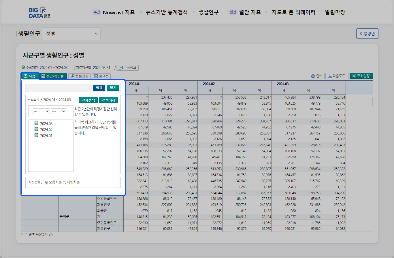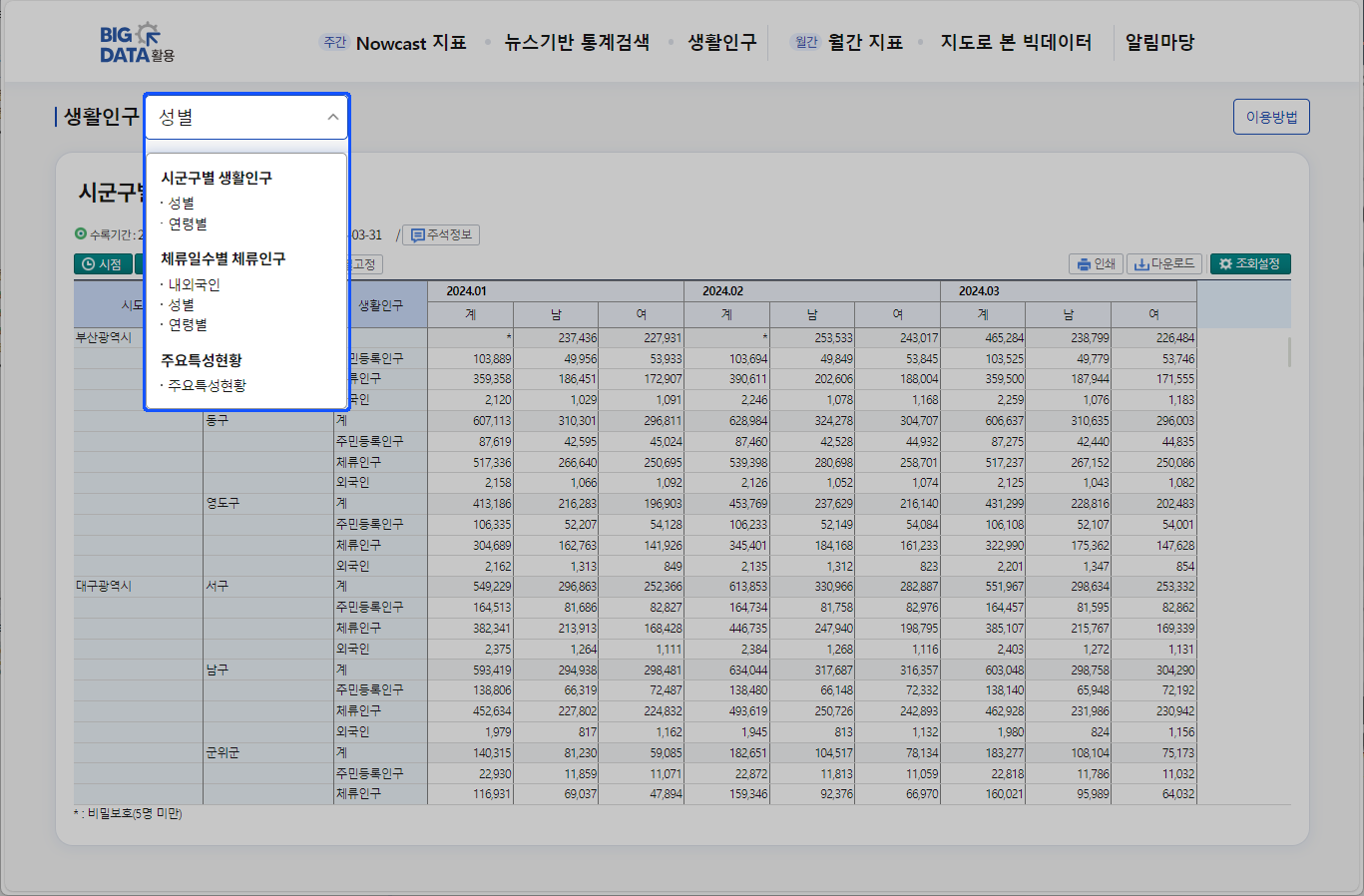 ① 성별인 경우 '계,남,여' 표시되는 항목을 선택하여 조회 할 수 있습니다.② 연령별인 경우 '계, 20세미만,20대,30대...' 표시되는 항목을 선택하여 조회 할 수 있습니다.