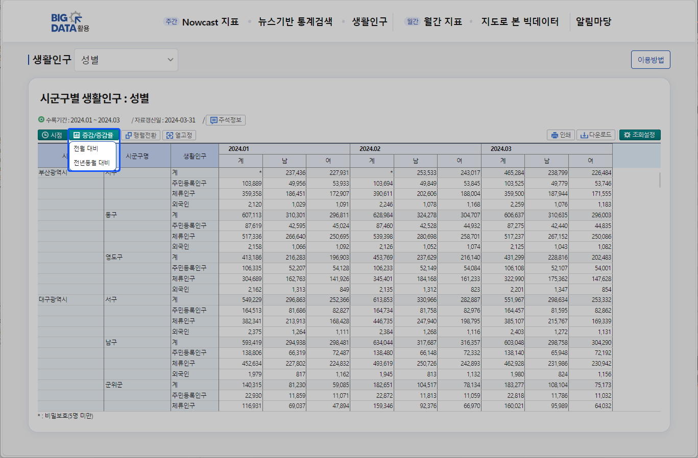 STEP3 증감/증감률 선택· '전월 대비' 선택 시 항목의 전월 대비 증감/증감률을 조회 할 수 있습니다. · '전년동월 대비' 선택 시 항목의 전년동뤌 대비 증감/증감률을 조회 할 수 있습니다.