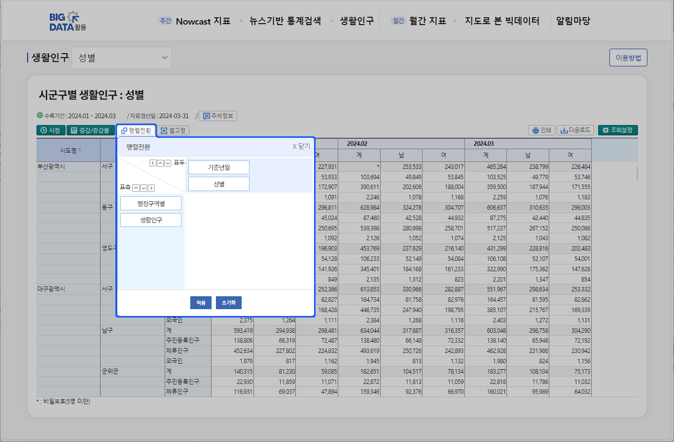 STEP4 행렬전환 선택· 표두와 표측을 원하는 항목을 이동하여 자료를 제공됩니다.· 항목을 클릭후 드레그하여 표두 또는 표측으로 이동시킨 후 '적용'을 클릭하면 변경된 테이블로 출력합니다. · '초기화'를 클릭하면 최초 조회 화면 상태로 표두와 표측 항목을 초기화 합니다.