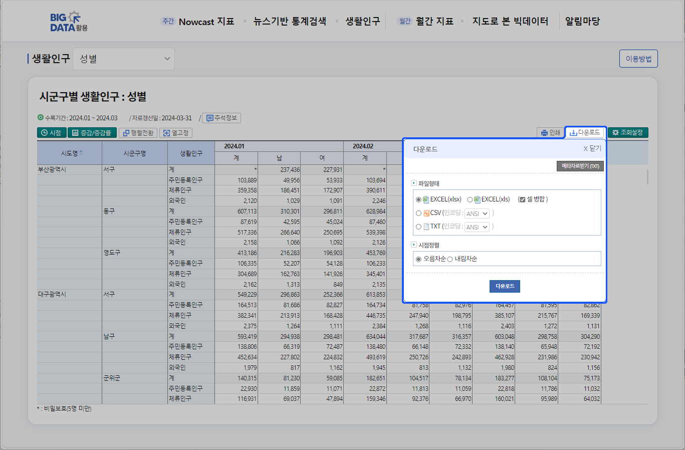 STEP5 다운로드· 엑셀, CSV, TXT 파일을 내려받을 수 있습니다.· 엑셀의 경우 '셀 병합' 체크하면 표측에 해당하는 내용에 대해 병합처리된 상태로 다운로드 합니다.· CSV,TXT 파일은 ANSI, UTF-8 파일 포멧을 선택하여 다운로드 할 수 있습니다.· 오름차순, 내림차순 선택에 따라 시점정렬된 상태로 자료를 다운로드 할 수 있습니다.
