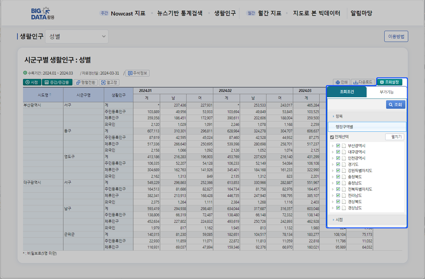 ① 시도별, 시군구별 세부적으로 선택하여 조회 할 수 있습니다.