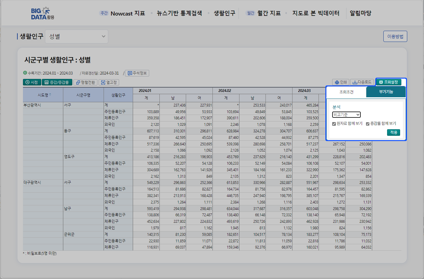 STEP7 조회설정 - 부가기능· 비교기준 '전월대비, 전년동월 대비' 증감/증감률을 선택하여 조회할 수 있습니다.